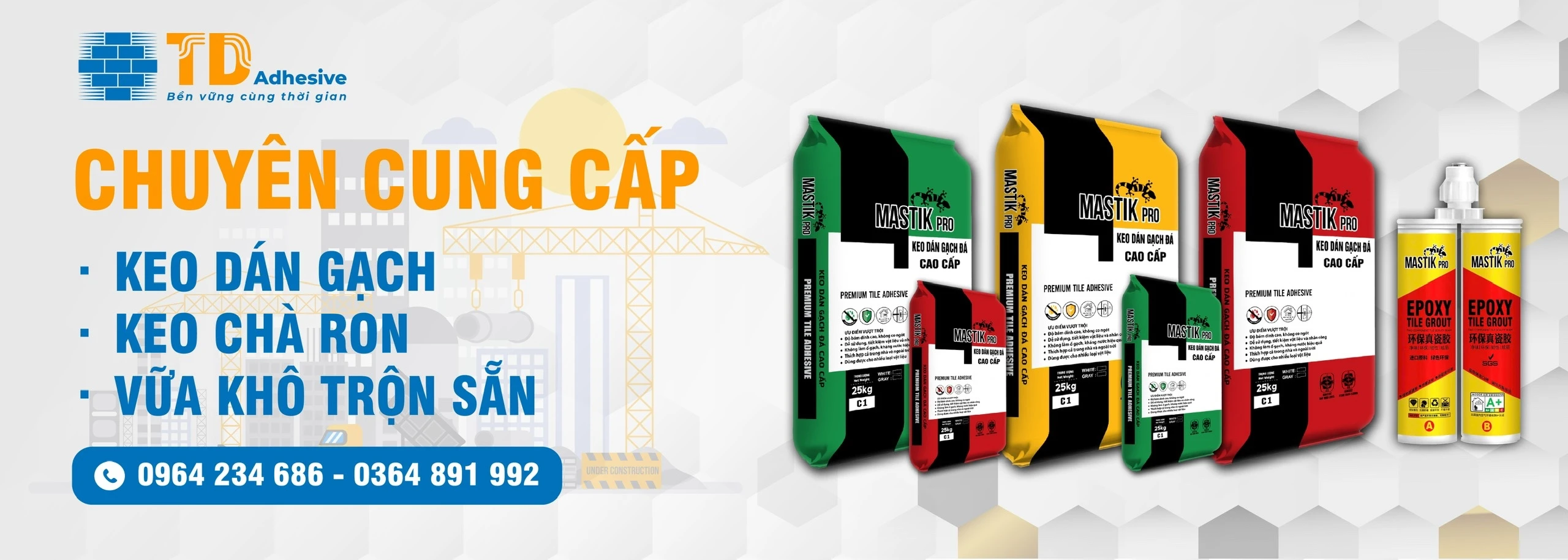 Chúng tôi tự hào là đối tác tin cậy của nhiều nhà thầu, thợ xây dựng và chủ đầu tư trong việc cung cấp giải pháp hoàn chỉnh về vật liệu dán gạch chuyên nghiệp.