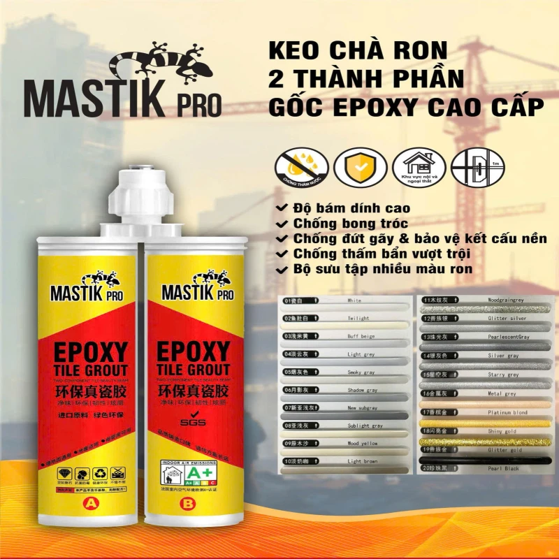 Keo Chà Ron 2 Thành Phần Gốc Epoxy Cao Cấp là sản phẩm chuyên dụng cho thi công mạch ron gạch và đá cao cấp, được phát triển trên nền tảng nhựa epoxy kết hợp chất đóng rắn đặc biệt, mang đến khả năng bám dính siêu mạnh, chống thấm tuyệt đối và chống bám bẩn vượt trội.